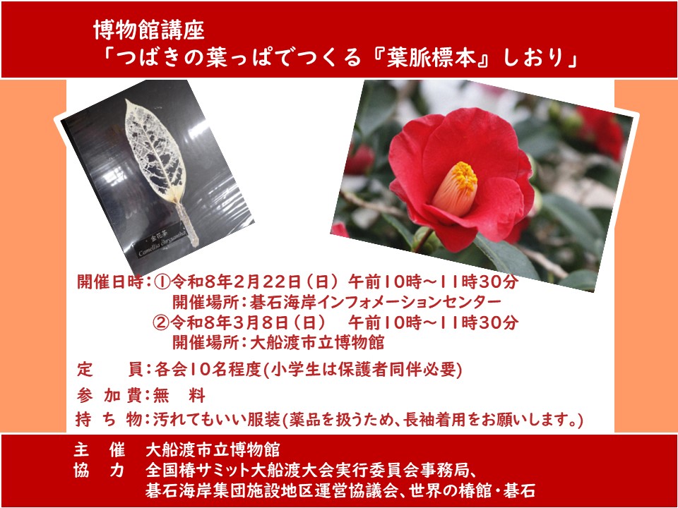 大船渡市立博物館さん主催で葉脈標本しおりづくりを開催します。
